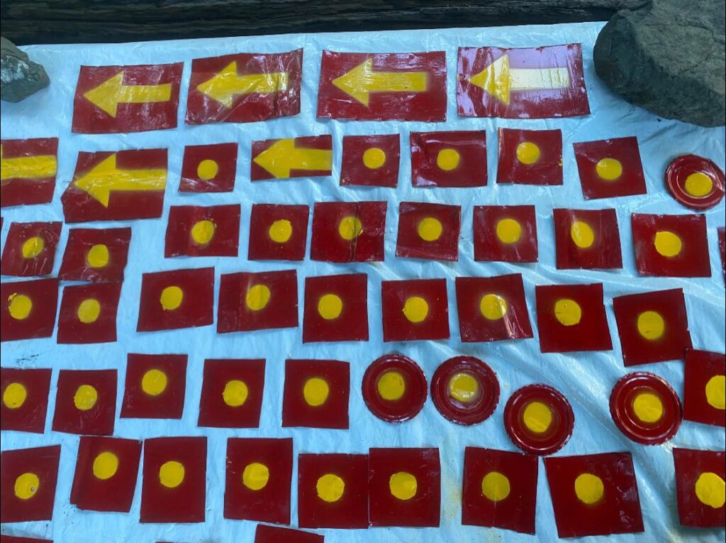 Colocamos marquitas de chapa que hicimos y pintamos, en dos colores rojo y amarillo, como indican las normas internacionales de señalizacion de senderos y les pucimos a cada una un pedacito de cinta reflectante, para ayudar a quienes se les hace de noche durante la caminata y mejorar la seguridad de quienes transitan por la picada.
