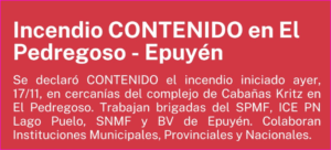 INCENDIO CONTENIDO en El Pedregoso - Epuyén Fecha: 19/11/25 - PARTE N° 3 - 19 HS Se declaró CONTENIDO el...