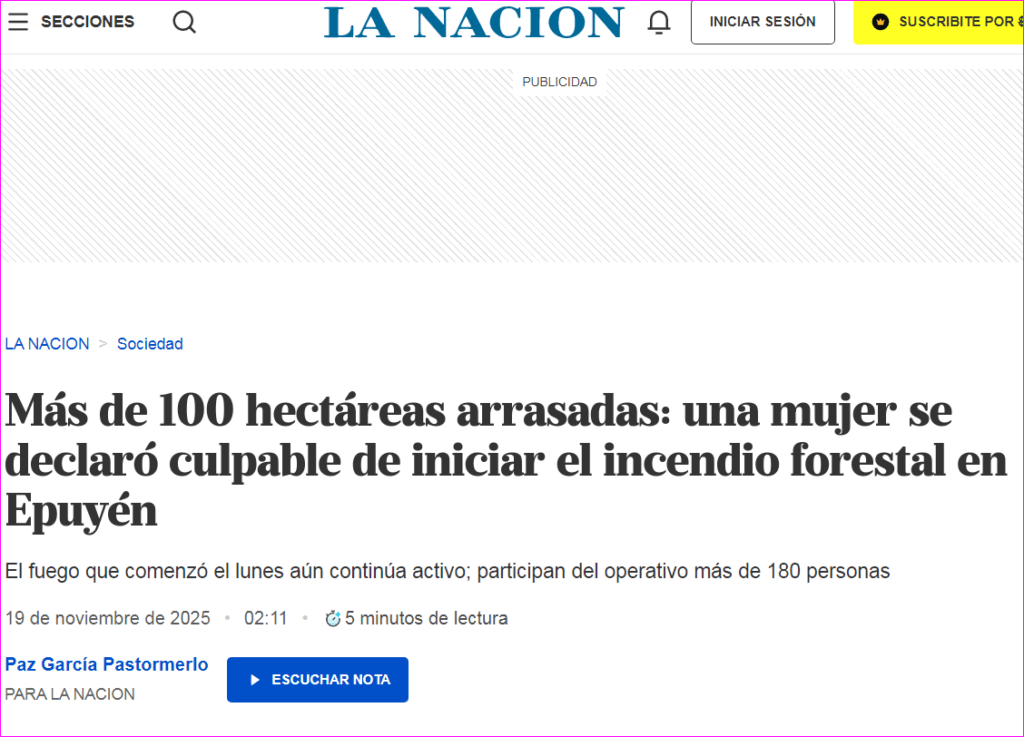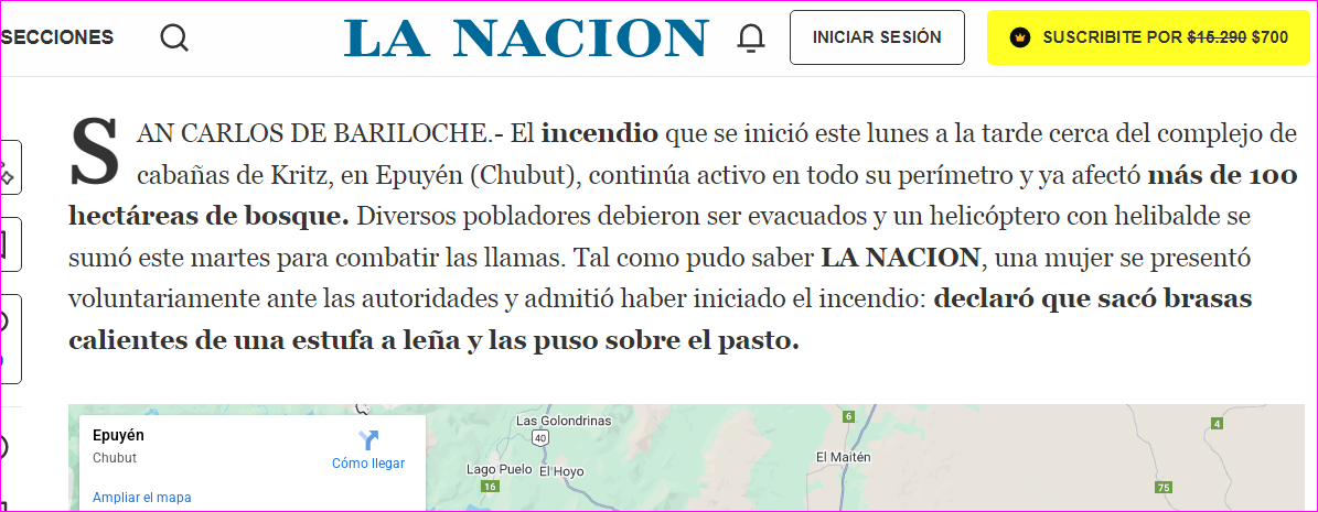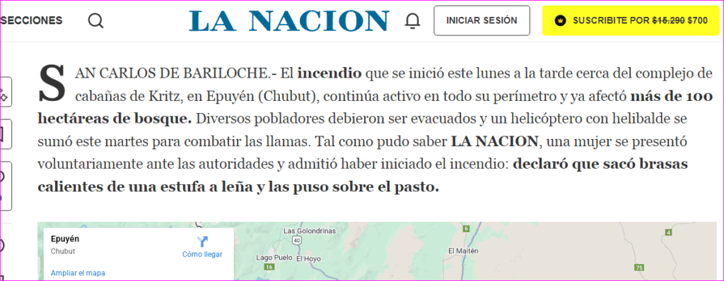 EL BOLSON – El incendio que se inició este lunes a la tarde cerca del complejo de cabañas de Kritz, en Epuyén (Chubut), continúa activo en todo su perímetro y ya afectó más de 100 hectáreas de bosque. Diversos pobladores debieron ser evacuados y un helicóptero con helibalde se sumó este martes para combatir las llamas. Una mujer se habria presentado voluntariamente ante las autoridades y habria admitido haber iniciado el incendio: según la publicacion del diario la nacion : ´declaró que sacó brasas calientes de una estufa a leña y las puso sobre el pasto¨.Según el primer informe difundido por el Servicio Provincial de Manejo del Fuego (SPMF) de Chubut, el fuego se inició el lunes alrededor de las 16.20 en el paraje El Pedregoso e indica como causa del incendio en el parte Nro uno , NEGLIGENCIA ( NDR : LA ACTITUD DE NEGLIGENCIA SOLO PUEDE SER PRODUCIDA POR UN SUJETO DE DERECHO- ).